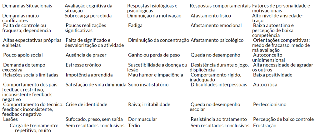 A seguir, apresento para vocês uma famosa tabela relacionando as demandas situacionais comuns ao burnout e treinamento excessivo em jovens atletas, a avaliação cognitiva da situação vivenciada pelos atletas bem como suas respostas fisiológicas e psicológicas, além das respostas comportamentais e fatores da personalidade e motivacionais associados que sofrem alteração.