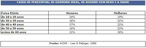 Precisamos falar sobre gordura! Certo? Gordura é a energia acumulada no nosso corpo, retirada dos alimentos ingeridos. E se torna um problema quando o armazenamento é maior que a necessidade. Então, para ter uma ideia, veja abaixo a tabela apresentando a faixa percentual de gordura ideal, conforme a ACMS: