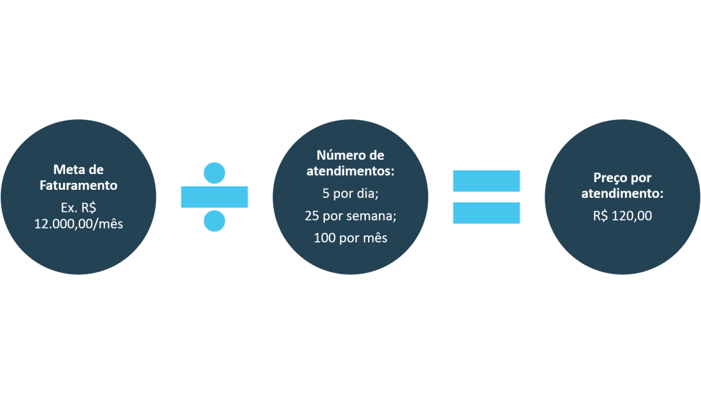 Outra forma de chegar à meta de faturamento é pensar a partir do preço por atendimento, o que seria a inversão do cálculo anterior, da seguinte forma: