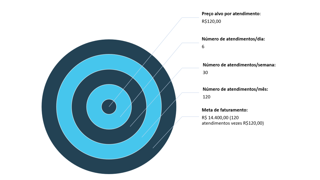 De posse das informações coletadas, passemos às contas. Uma forma é estabelecer um montante desejado, dividindo-o posteriormente pelo número de atendimentos que você deseja fazer: