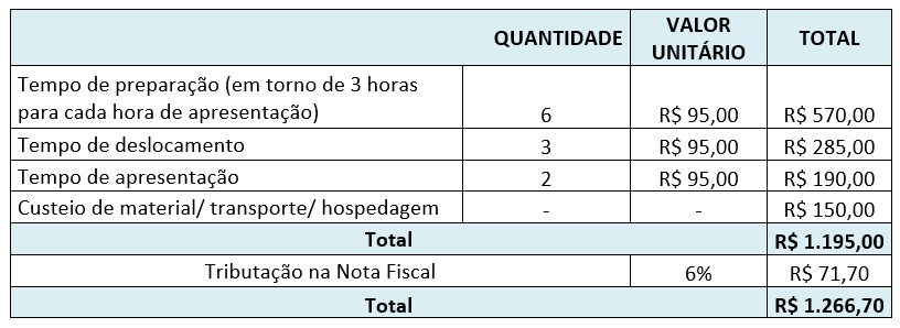 - Tempo de preparação (em torno de 3 horas para cada hora de apresentação);
